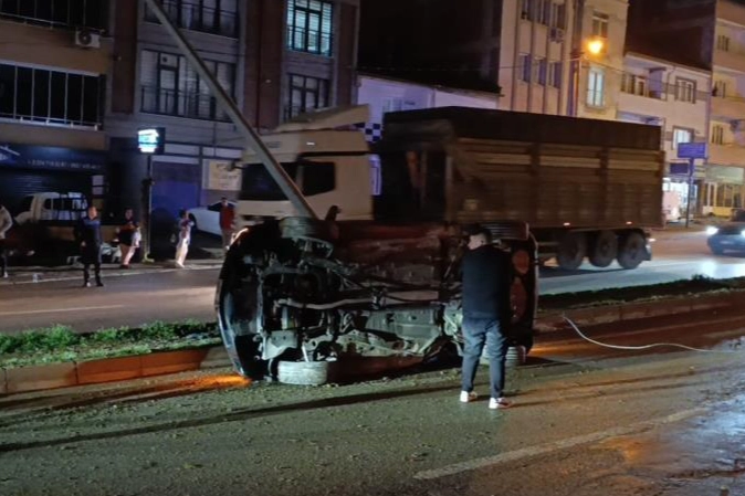 Bursa'nın İnegöl ilçesinde yağış nedeniyle kayganlaşan yolda kontrolden çıkan otomobilin takla atarak aydınlatma direğine çarptığı kazanın güvenlik kamerası görüntüleri ortaya çıktı. Kazada 3 kişi yaralandı.