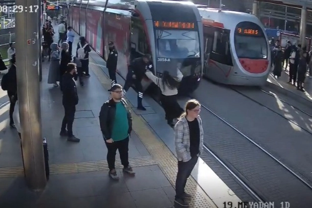 Cumhuriyet meydanındaki raylı sistem hattında meydana gelen olayda, kulaklığı takılı olduğu için çevresini fark edemeyen genç kız, karşıya geçmek için tramvay yoluna doğru hamle yaptı. Durumu fark eden güvenlik görevlisi genç kızı çekerek tramvayın altında kalmaktan son anda kurtardı. Olay, güvenlik kamerası ve tramvay içi kamera tarafından saniye saniye kaydedildi.