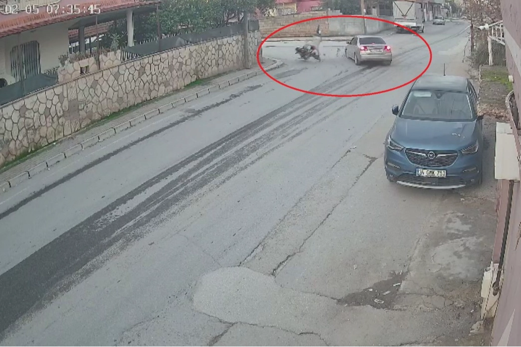 Hatay’ın Reyhanlı ilçesinde otomobille çarpışan motosiklet sürücüsünün metrelerce havaya savrularak yaralandığı anlar kameraya yansıdı.