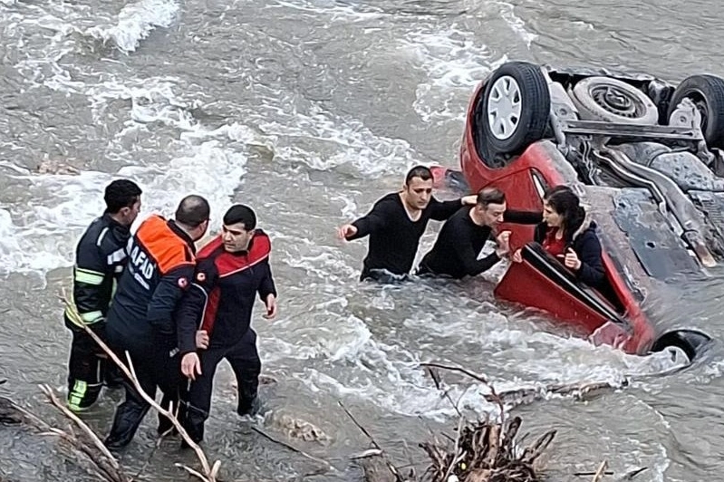 Kazaya karışan araç, vinçle nehirden çekilirken, olayla ilgili soruşturma başlatıldı. Görgü tanığı Abdullah Kartal, “Kaza olduktan sonra otomobil nehre uçtu ve akıntıyla sürüklendi. Ekipler, içeridekileri kurtarmayı başardı” şeklinde konuştu.