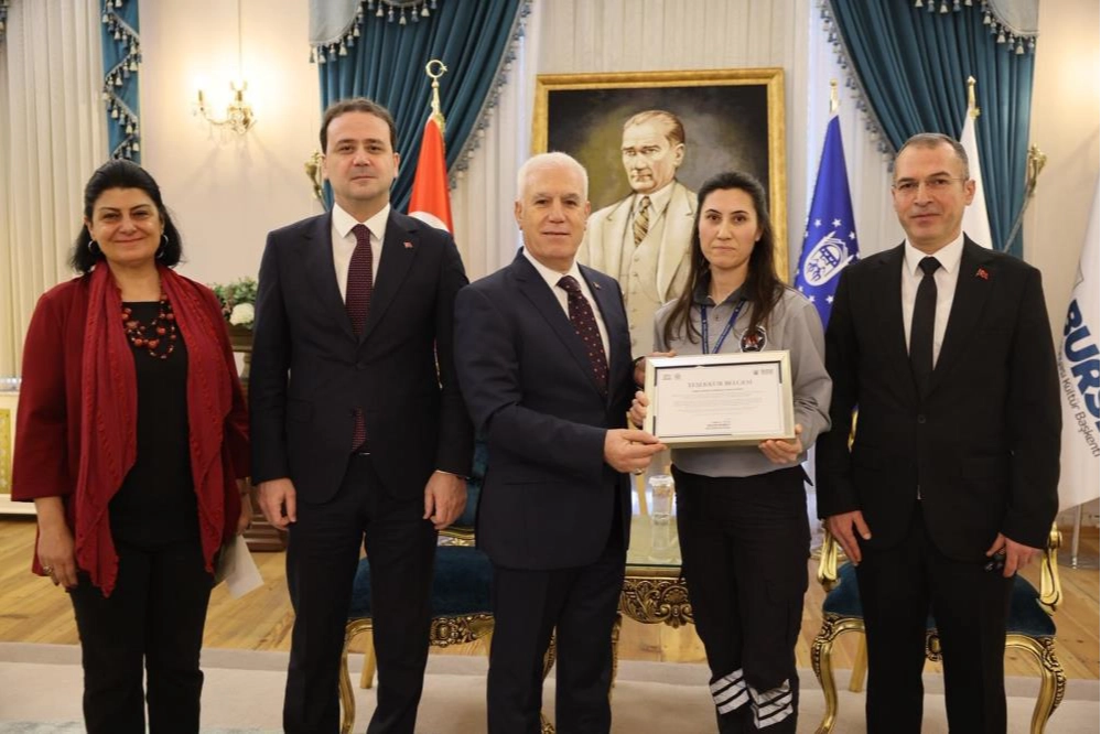 Bursa Büyükşehir Belediye Başkanı Mustafa Bozbey, güvenlik görevlisi Fatma Yılmaz'a vatandaşları güler yüzle karşılaması v teşekkür belgesi verdi.