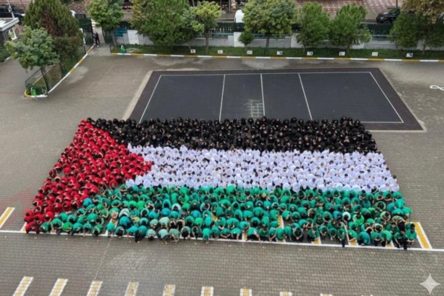 Bursa’nın Yıldırım ilçesindeki bir ilkokulda öğrenciler, Filistin bayrağının renklerinde giyinerek okul bahçesinde dev bir bayrak koreografisi oluşturdu. Millî Eğitim Bakanlığı tarafından tüm okullara gönderilen genelge kapsamında, Şehit Piyade Onbaşı Orhan Tezcan İlköğretim Okulu’nda anlamlı bir etkinlik düzenlendi. 600 öğrenci, Filistin’e destek vermek amacıyla okul bahçesinde bir araya gelerek dev bir Filistin bayrağı oluşturdu. Etkinlik kapsamında öğrenciler, Filistin bayrağının renklerini taşıyan kıyafetler giyerek barış, kardeşlik ve dayanışma mesajı verdi. El ele vererek oluşturulan dev Filistin bayrağı, okul bahçesini adeta bir barış sahnesine dönüştürdü.