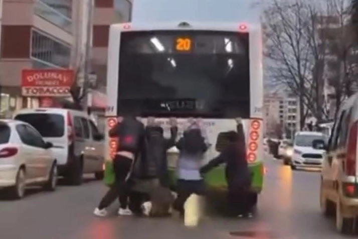 Bursa'nın Yıldırım ilçesine bağlı Millet Mahallesi Cengizhan Caddesi üzerinde seyir halindeki belediye otobüsünün arkasına tutunarak ilerleyen 4 çocuk, çevrede paniğe neden oldu. Tehlikeye aldırış etmeyen çocuklar, elleriyle otobüse tutunup ayaklarını yere sürterek adeta dans eder gibi yolculuk yaptı.