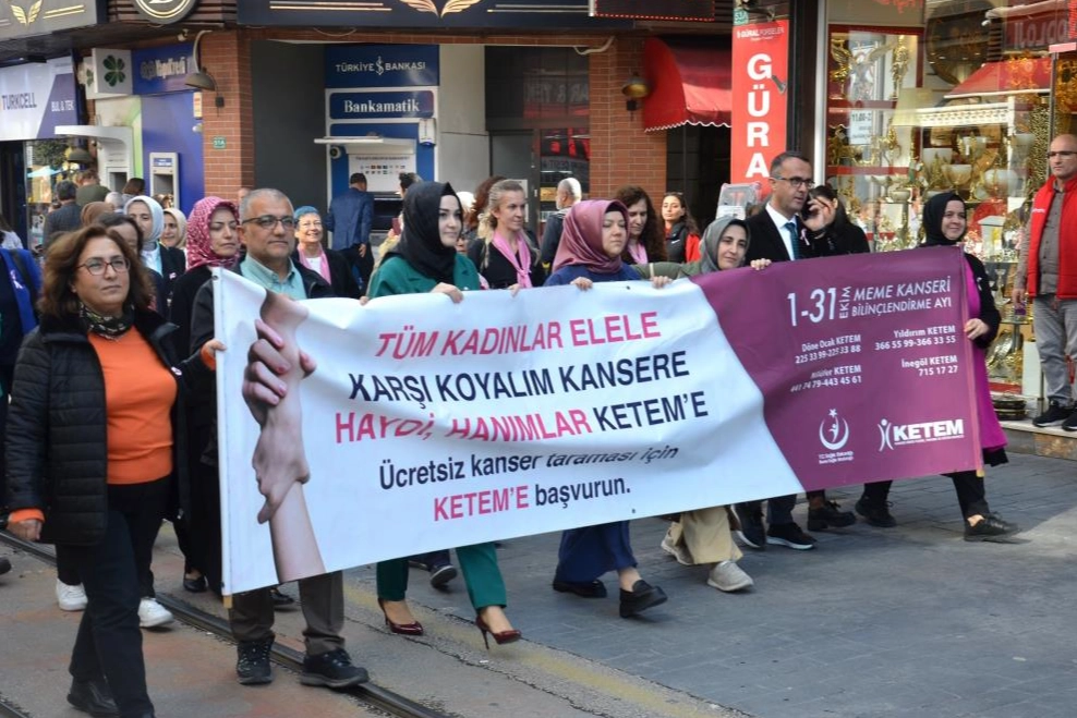 Bursa İl Sağlık Müdürlüğü tarafından, meme kanserinde erken teşhisin önemine dikkat çekmek amacıyla Cumhuriyet Caddesi'nde yürüyüş etkinliği düzenlendi. Yürüyüşün ardından şehrin merkezi noktalarından olan Tophane surlarına meme kanserinin simgesi olan dev ‘Pembe kurdele' asıldı. Sağlık Bakanlığı tarafından ülke genelinde yürütülen 1-31 Ekim Meme Kanseri Farkındalık Ayı etkinlikleri kapsamında gerçekleştirilen etkinlikte Cumhuriyet Caddesi'nden Zafer Meydanı'na doğru yoğun katılımla gerçekleşen bir yürüyüş yapıldı. Bursa Büyükşehir Belediyesi Bandosu'nun marşlarıyla eşlik ettiği yürüyüşe; İl Sağlık Müdürlüğü Halk Sağlığı Hizmetleri Başkanı Dr. İrfan Oğuz, Kamu Hastaneleri Başkanı Dr. Melike Savaş, sağlık çalışanları, sivil toplum kuruluşları, kanser dernekleri ve öğrenciler katıldı. Vatandaşların yoğun ilgiyle takip ettiği etkinlikte, lise öğrencileri ellerinde tuttuğu meme kanserinin simgesi olan dev ‘pembe kurdele' ile cadde boyunca yürüyüşe eşlik etti. Yürüyüşün ardından Zafer Meydanı'nda konuşan Bursa Halk Sağlığı Hizmetleri Başkanı Dr. İrfan Oğuz, meme kanseri konusunda toplumsal bir bilinç oluşturabilmek adına etkinliği düzenlediklerini söyledi. Meme kanserinin kadınlarda kanser türlerinin içerisinde ölüm nedenlerinde ilk sıralarda geldiğini hatırlatan Dr. Oğuz, ‘Bu çerçevede bizler de geçen sene sağlıklı hayat merkezlerimiz ve ikinci basamak kuruluşlarımızda 276 binden fazla kişiye kanser taraması yaptık. Bunların arasında meme kanseri, kolorektal ve rahim ağzı kanseri olmak üzere, 210 kişide kanser erken dönemde teşhis edildi. İşin sadece mali boyutunu düşünsek bile bir kanser hastasını erken dönemde yakalamak hem hasta, hem devletimiz için birçok mali yükten kurtulmak demektir. Bunun yanında kanser hastalığının sosyal ve psikolojik kısımları da fazlasıyla yıpratıcı olmaktadır" diye konuştu.
