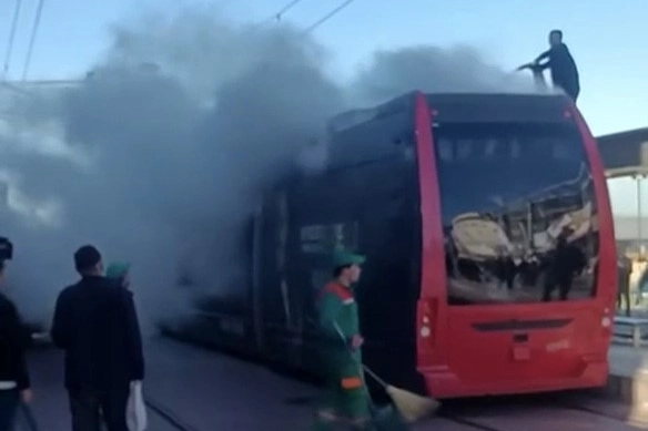 Seyir halinceki tramvayda yangın meydana geldi. Birden dumanlar yükseldi... Bursa'nın Osmangazi ilçesinde seyir halindeyken arıza yapan "İpek Böceği" tramvayında yangın çıktı. Dumanların yükseldiği tramvayda yolcular kısa sürede tahliye edilirken, olay yerine gelen itfaiye ekipleri alevlere müdahale etti. Yangın nedeniyle tramvay seferlerinde kısa süreli aksamalar yaşandı.