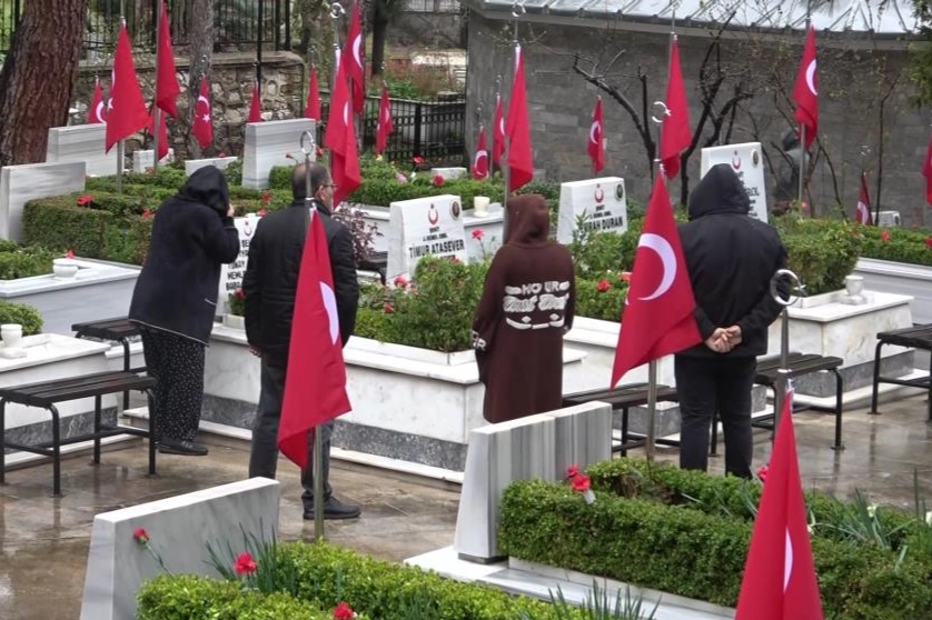 Bursa'da şehitlikte bir araya gelen aileler, kabir başlarında Kur'an-ı Kerim okuyup dua etti.