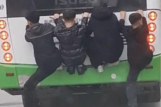 Bursa'da, Millet Mahallesi'nde özel halk otobüsünün arkasına asılan öğrenciler, trafikte ilerleyen otobüsün arasında yolculuk yaptı. Otobüs şoförünün durumdan haberdar olmadığı öğrenilirken, öğrencilerin bu davranışı gören vatandaşlar büyük panik yaşadı. Görüntülerde, öğrencilerin hiçbir güvenlik önlemi olmadan otobüsün arka kısmına tutunarak seyir halinde ilerlediği anlar yer aldı. Muhtemel bir ani fren ya da manevrada yaşanabilecek bir kazanın faciaya yol açabileceği belirtildi. Yetkililer, bu tür tehlikeli davranışların hem can güvenliğini tehdit ettiğini hem de ağır yaralanma ve ölümle sonuçlanabilecek kazalara davetiye çıkardığını vurgulayarak, özellikle gençlerin trafik kurallarına uyması konusunda uyarılarda bulundu.