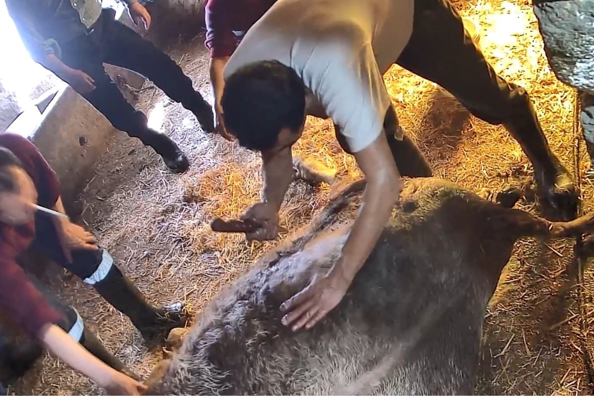 Ahıra gelen S.T., önce doğmakta olan buzağının ayaklarına ip bağlayarak normal doğumla buzağıyı çıkarmaya çalıştı. Ahırda toplanan toplam 5 kişinin çabalarına rağmen doğum gerçekleşmedi.