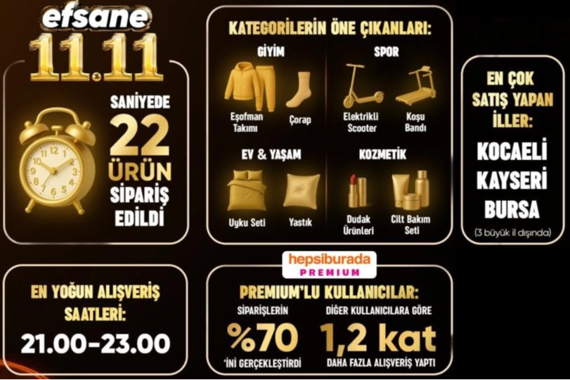 Bu yılın elektronik ve mobil kategorilerinde cep telefonu, robot süpürge, kablosuz süpürge en çok tercih edilen ürünler olurken müşteriler altın alımı için de e-ticareti seçti. Giyim kategorisinde çorap ve eşofman takımı, spor kategorisinde elektrikli scooter, koşu bandı ve termos öne çıktı. Ev-yaşam kategorisinde uyku seti ve yastık, kozmetikte ise cilt bakım seti, dudak ürünü ve fondöten tercih edildi. En çok aranan markalar arasında Roborock, Dyson, Fissler, Stanley, Jack Wolfskin, Philips ve Lego yer aldı. Efsane 11.11'de kullanıcıların yüzde 88'i alışverişini Hepsiburada mobil uygulaması üzerinden gerçekleştirdi. Kadın kullanıcılar giyim, temel tüketim ve kozmetik kategorilerine yönelirken; erkek kullanıcılar küçük ev aletleri, temel tüketim ve sağlık & güzellik kategorilerinde yoğunlaştı. Efsane Kasım öncesinde iş ortaklarına satışlarını artıracak çözümler sunuldu Şehir bazında incelendiğinde, üç büyük ilin dışında en fazla alışveriş Bursa, Kocaeli ve Antalya'da yapıldı. Hepsiburada Efsane Kasım öncesinde iş ortaklarına satışlarını artıracak çözümler sundu. Pazarlamadan ticari desteğe, lojistikten kargoya kadar pek çok destek iş ortaklarına sunuldu. Bu kapsamda en çok satış gerçekleştirilen iller yine üç büyük ilin dışında Kocaeli, Kayseri ve Bursa oldu. Akdeniz ve Ege bölgesi 11.11'de en çok cep telefonu kategorisinden alışveriş yaparken, Doğu Anadolu, Güneydoğu Anadolu, İç Anadolu, Karadeniz ve Marmara Bölgeleri küçük ev aletlerine yoğun ilgi gösterdi. Hepsiburada Premium'un kampanyadaki etkisinin bu yıl da hissedildiği belirtildi. Siparişlerin yüzde 70'i Premium üyeler tarafından gerçekleştirildi. Premium kullanıcılar, 11 Kasım günü diğer kullanıcılara göre 1,2 kat daha fazla alışveriş yaptı. Hepsiburada, Efsane 11.11 kapsamında Kia Picanto'yu özel bir fiyatla satışa sundu. 11 Kasım günü saat 10.00'da satışa çıkan araç, kampanyanın başlangıcından itibaren yoğun talep gördü. Araçların satışı aynı gün içinde tamamlandı. En yüksek talep üç büyük il ve çevresinden geldi. Efsane Kasım fırsatları devam ediyor Platform, 11.11'de kırdığı rekorun ardından Kasım ayı kampanyalarına hız kesmeden devam ettiğini duyurdu. E-Ticaret Haftası'na özel düzenlenecek kampanyayla moda, teknoloji, ev-yaşam, süpermarket ve kişisel bakım kategorilerinde avantajlı alışveriş fırsatları müşterilerle buluşturulacak. Ayın son haftasında başlayacak Efsane Cuma döneminde ise kullanıcıları, geniş ürün yelpazesinde avantajlı teklifler bekliyor.
