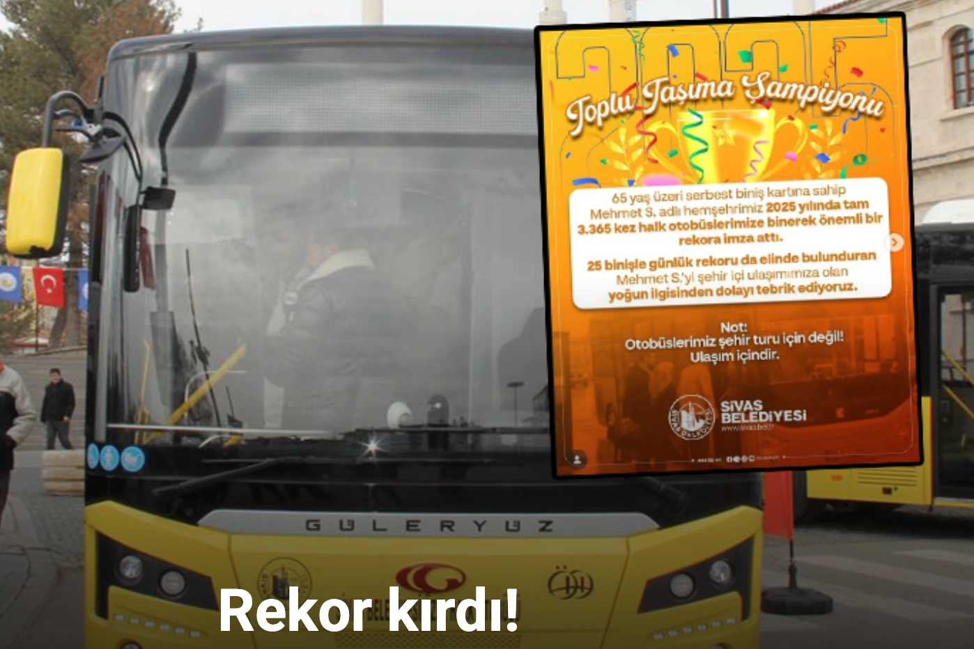 Sivas Belediyesi sosyal medya hesapları üzerinden yapılan paylaşımda, "65 yaş üzeri serbest biniş kartına sahip Mehmet S. adlı hemşerimiz, 2025 yılında tam 3.365 kez halk otobüslerimize binerek önemli bir rekora imza attı. 25 Binişte günlük rekoru da elinde bulunduran Mehmet S'yi şehir içi ulaşımımıza olan yoğun ilgisinden dolayı tebrik ediyoruz" ifadelerine yer verildi.