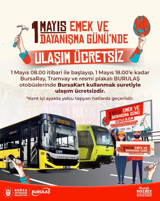 Bursa'da 1 Mayıs İşçi Bayramı nedeniyle 08.00 - 18.00 saatleri arasında BursaRay ve tramvay hatları ile resmi plakalı Burulaş otobüsleriyle ulaşım ücretsiz olacak.