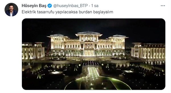 Bağımsız Türkiye Partisi Genel Başkanı Hüseyin Baş, twitter hesabından yaptığı paylaşımda Beştepe Cumhurbaşkanlığı Küllliyesi'nin fotoğrafını paylaşarak; "Elektrik tasarrufu yapılacaksa burdan başlayalım" dedi.