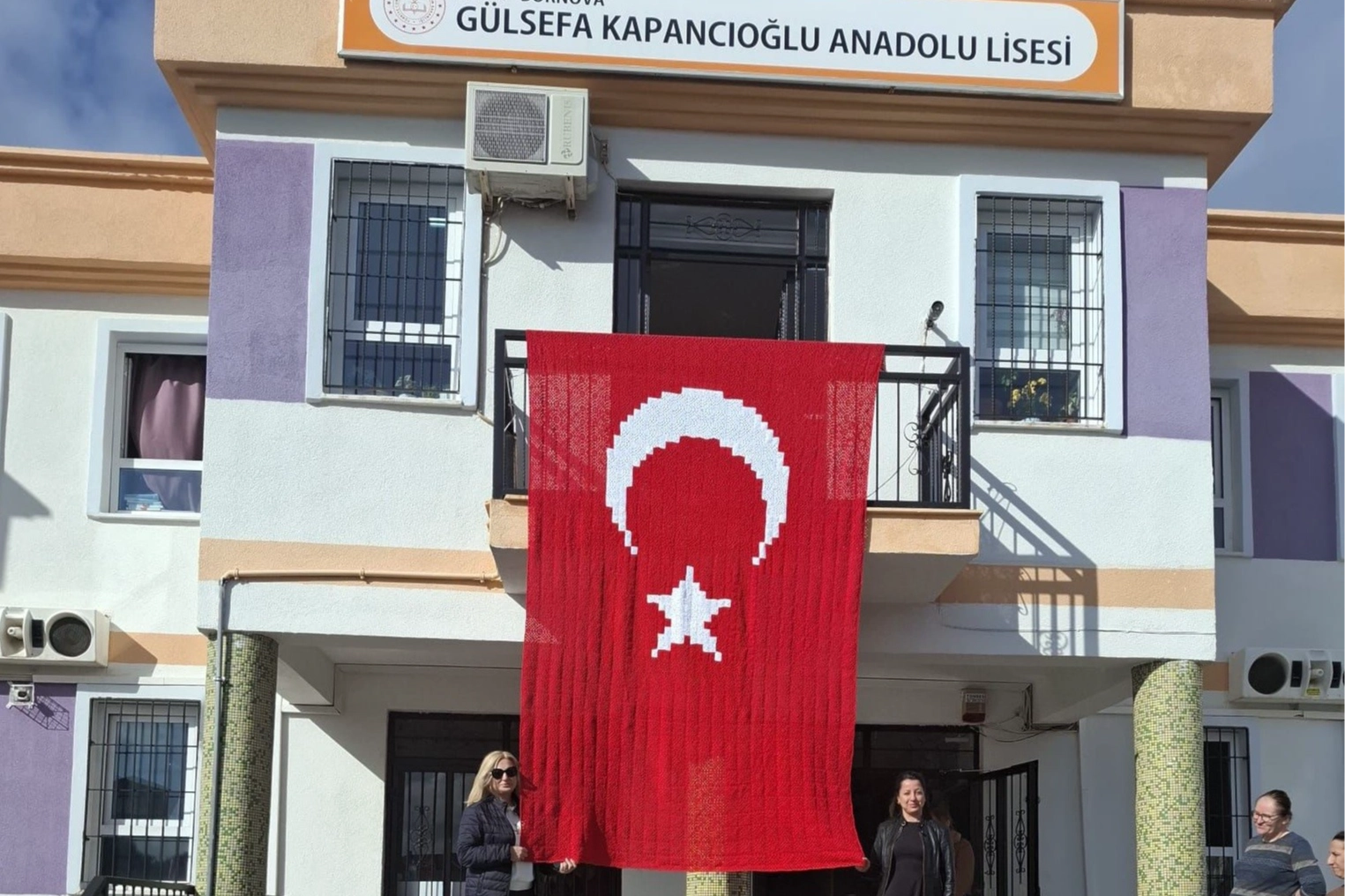 İzmir’in Bornova ilçesinde bir lisede öğretmen, öğrenci ve velilerin birlikte yürüttüğü çalışma kapsamında el emeği ile örülen dev Türk bayrağı, okul binasına asıldı.