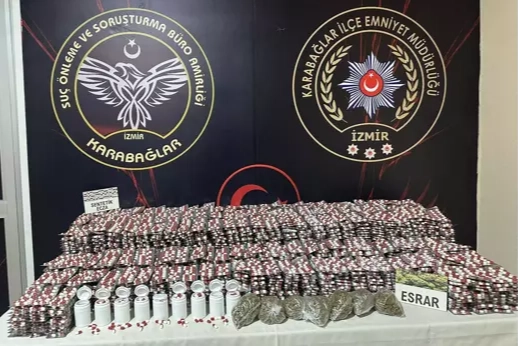 Şüphelinin kullandığı araçta yapılan aramada, kolilere gizlenmiş şekilde büyük miktarda sentetik hap ve esrar bulundu.