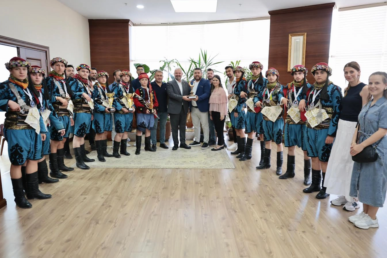 Menemen Belediyesi Kültür ve Halk Oyunları Spor Kulübü, Şanlıurfa'da düzenlenen Türkiye Halk Oyunları Gençler Şampiyonası'nda aldığı başarıyla ilçenin gururu oldu. Menemenli gençler, Geleneksel Dal Türkiye Birincisi oldu. Menemen'in ve Ege'nin kültürel mirasını en iyi şekilde sergileyen ve başarılarını ödülle taçlandıran gençlerin, turnuva sonrasında ilk ziyaret ettikleri adres, Menemen Belediyesi oldu. Menemen Belediye Başkanı Aydın Pehlivan'ı makamında ziyaret eden genç sporcular, antrenörleri ve kulüp yöneticileri, kazanılan kupayı Başkan pehlivan'a takdim etti. "SIRADA ULUSLARARASI BAŞARILAR VAR" Halk oyunlarında Türkiye şampiyonluğu elde edilmesinin Menemen için bir gurur kaynağı olduğunu dile getiren Menemen Belediye Başkanı Aydın Pehlivan, "Göreve geldiğimiz ilk günden itibaren sanat ve sporu kendimiz için bir kırmızı çizgi olarak belirledik. Çocuklarımızın, gençlerimizin ve kadınlarımızın bu alanlarda gelişimlerini, elimizden gelen tüm imkanlarımızla destekliyoruz. Bu noktada ücretsiz kurslarımız ve birbiri ardına açtığımız tesislerimizle Menemen'imize hizmet veriyoruz. Son olarak halk oyunları ekibimizin, Türkiye çapındaki bir şampiyonada birincilik elde etmesi, göğsümüzü kabarttı. Gençlerimizle, antrenörleriyle ve kulüp yöneticilerimizle gurur duyuyoruz. Bölgesel ve ulusal turnuvalarda aldığımız başarılar gösteriyor ki, önümüzdeki süreçte çeşitli branşlarda uluslararası başarılar görmeye başlayacağız. Menemen'imizin adını ve ülkemizin şanlı bayrağını, Dünya'nın farklı yerlerinde dalgalandırmak için, çalışmalarımıza titizlikle devam edeceğiz." dedi.