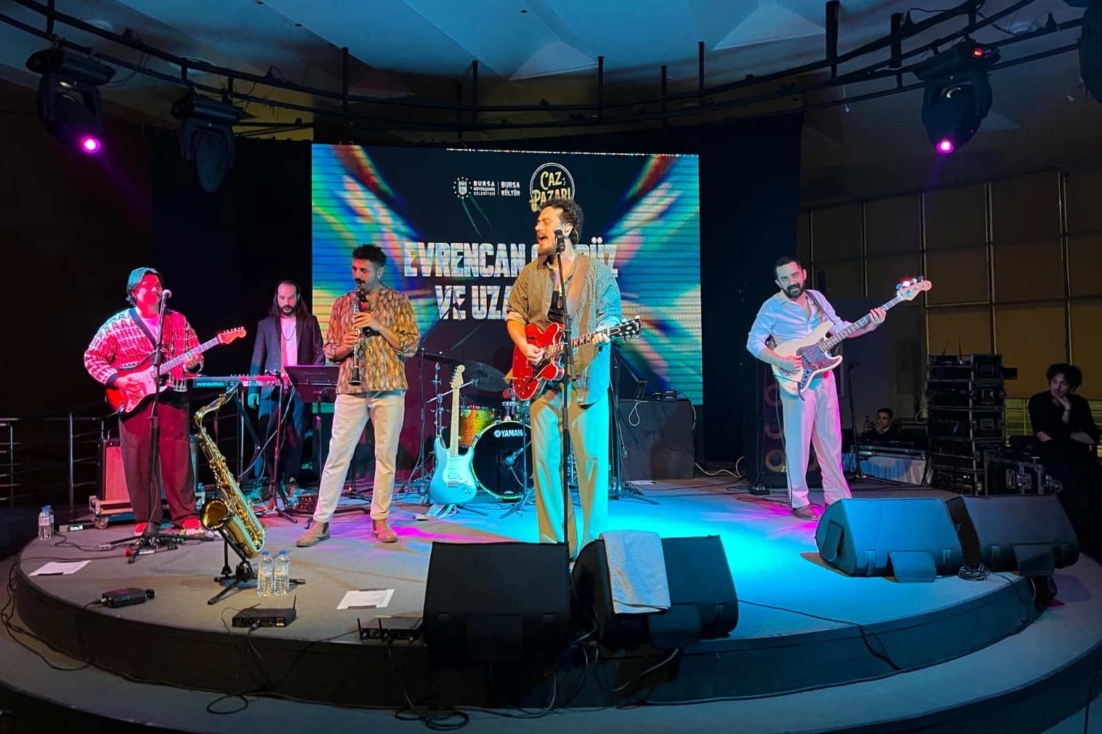 Bursa'da ‘Caz Pazarı Konserleri’ kapsamında sahne alan Evrencan Gündüz ve Uzaylılar, blues, rock ve cazın iç içe geçtiği repertuvarlarıyla müzikseverlerden büyük beğeni topladı. Bursa Büyükşehir Belediyesi Kültür, Sanat ve Sosyal İşler Dairesi Başkanlığı tarafından her ay düzenlenen ‘Caz Pazarı’ konserleri, caz müziğinin keyifli melodilerini sanatseverlerle buluşturmaya devam ediyor. Projenin son konuğu, Evrencan Gündüz ve Uzaylılar oldu. Geniş repertuvarı ve sahnedeki enerjisiyle dinleyenlere keyifli bir akşam yaşatan grup, kendine has yorumları ve güçlü sahne performansıyla dikkat çekti. Konser boyunca izleyiciler alkışlarıyla sanatçılara eşlik ederken, salonda coşkulu anlar yaşandı. Programın sonunda Kültür, Sanat ve Sosyal İşler Dairesi Başkanı Şafak Baba Pala, başarılı performanslarından dolayı Evrencan Gündüz’e çiçek takdim ederek teşekkürlerini iletti.