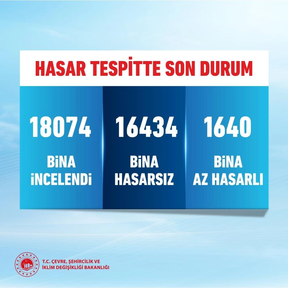 Çevre, Şehircilik ve İklim Değişikliği Bakanlığı 23 Nisan tarihinde İstanbul'da meydana gelen 6.2 şiddetindeki depremin ardından hasar tespit çalışmalarına başladı. Yapılan hasar tespit çalışmaları hakkında sosyal medya hesabından paylaşımda bulunan Bakan Kurum şu ifadelere yer verdi:"18 bin 74 binayı inceledik. 16 bin 434 binanın hasarsız, 1640 binanın az hasarlı olduğunu tespit ettik. Hasar tespit çalışmalarımızın tamamlanmasıyla gerekeni yapacağız".