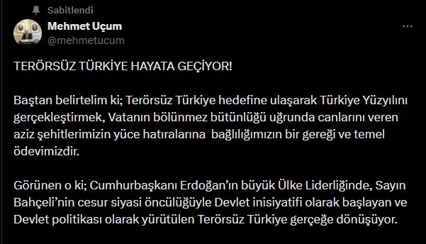 "Terörsüz Türkiye hayata geçiyor!" başlıklı bir yazı kaleme alan Mehmet Uçum, "Terörsüz Türkiye için yapılan açıklamaların ortaya koyduğu şudur: Kürtler, Türk Milletinin asli kurucu bileşenidir. Kürtler, Türk Milletinin ayrılmaz parçası sıfatıyla Türkiye Cumhuriyetinin kurucusu ve daimi sahibidir. Türkiye Cumhuriyeti Devleti Kürtlerin de Milli Devleti’dir. Türkiye Yüzyılı; Türk ve Kürt yüzyılıdır. Tam da bu paradigmaya uygun olarak yapılan tüm açıklamalar Terörsüz Türkiye’ye geçişte temel aşamanın tamamlandığını gösteriyor. Ayrıca bu açıklamalar Kürtlerin Türkiye Cumhuriyeti Devleti ve Türk Milleti ile bütünleşmesinin tarihsel teyidi ve ilanıdır" dedi.