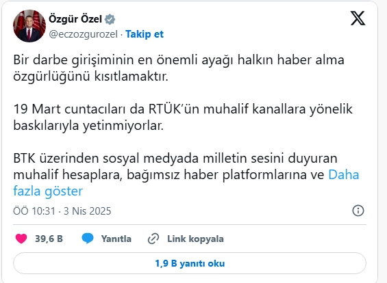 "Bir darbe girişiminin en önemli ayağı halkın haber alma özgürlüğünü kısıtlamaktır. 19 Mart cuntacıları da RTÜK’ün muhalif kanallara yönelik baskılarıyla yetinmiyorlar. BTK üzerinden sosyal medyada milletin sesini duyuran muhalif hesaplara, bağımsız haber platformlarına ve yurttaş gazeteciliği yapan profillere erişim engeli getirmeye çalışıyorlar. X Türkiye ve Global Affairs’e açık çağrımdır: Bu millet cuntacıların medya düzenini yıktı geçti. Bu güne kadar yüzlerce sayfayı 'nasıl olsa anlaşılmaz' diyerek kapattığınızı biliyoruz. Siz bugün antidemokratik uygulamalara alet olursanız, erişim engeli taleplerini uygularsanız bu millet size ne yapar iyi düşünün."Haber Merkezi