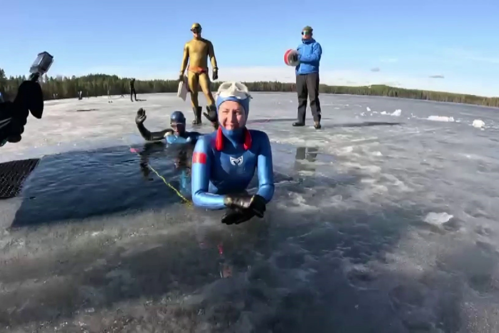 Finlandiya’da yaklaşık 30 santimetre kalınlığındaki buz tabakasının altında yapılan dalışta Erken, monofin kullanarak tek nefesle 141 metre ilerledi.