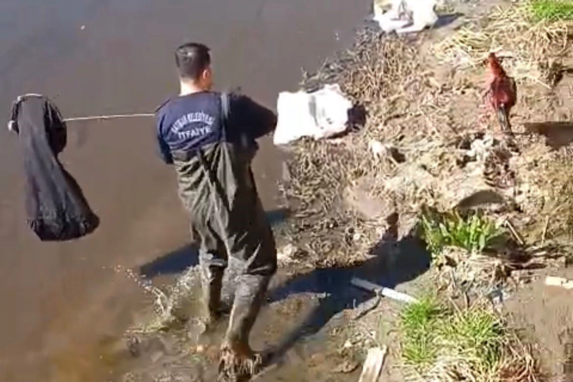 İhbar üzerine kısa sürede olay yerine gelen itfaiye ekipleri, dere yatağının yüksek ve kaygan olması nedeniyle merdiven yardımıyla aşağı indi.