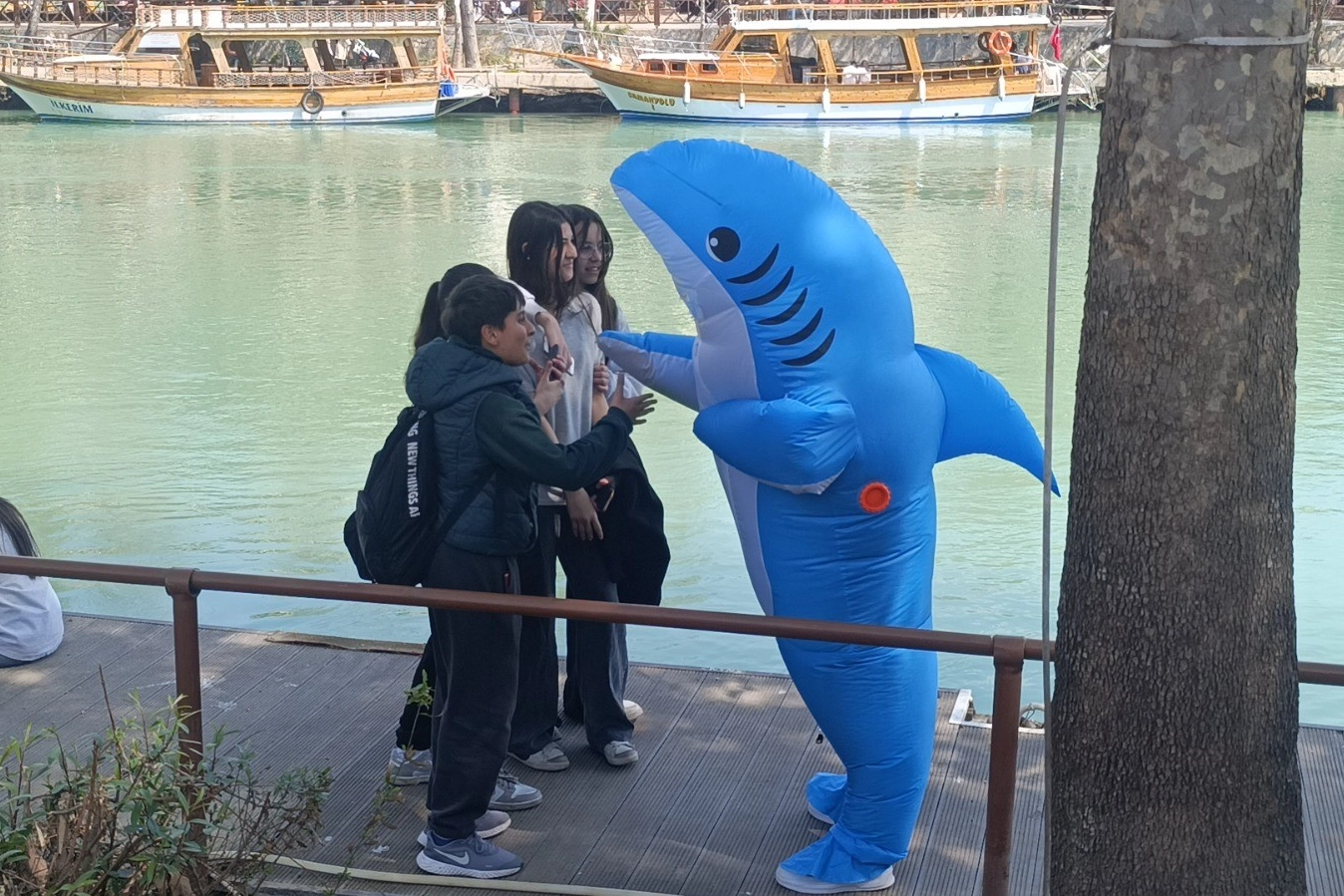 Antalya’nın Manavgat ilçesinde köpek balığı kostümü giyerek sokaklarda dolaşan bir genç, ilginç görüntülere sahne oldu. Vatandaşları eğlendirmek amacıyla kostüm giydiğini söyleyen genç, özellikle çocuklar ve gençlerin yoğun ilgisiyle karşılaştı.