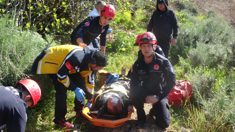 Vücudunun çeşitli yerlerinde yaralanmalar olduğu belirlenen yaralıya serum takıldı ve boyunluk uygulanarak sepet sedyeye sabitlendi. Ardından itfaiye ve sağlık ekipleri tarafından patika yoldan ambulansa taşındı.