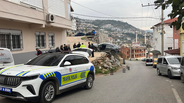 Antalya’nın Alanya ilçesinde geri manevra yapan SUV tipi araç, yol kenarındaki şarampole arka iki tekerleğiyle asılı kaldı.