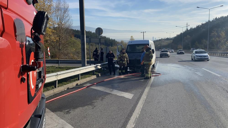 Bursa'nın Mudanya ilçesinde bir minibüs yük taşıdığı esnada motor kısmından alev aldı. Yanan minibüse yoldan geçen BUSKİ ekipleri müdahale etti.