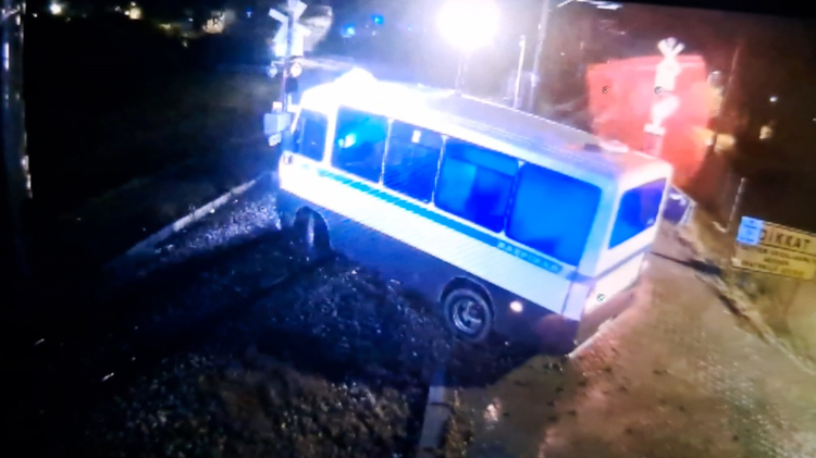 Kırıkkale’de hemzemin geçitte ray üzerinde kalan bir dolmuşa Doğu Ekspresi yolcu treninin çarptığı anlar güvenlik kamerasına yansıdı.