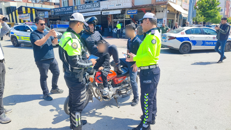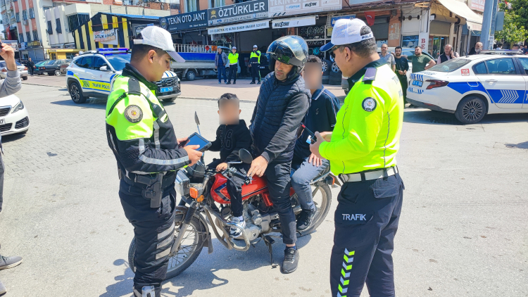 Denetimler sırasında bir sürücünün, fiziksel engelli oğlunu kask takmadan motosikletin ön kısmında taşıdığı tespit edildi. Polis ekipleri tarafından durdurulan sürücüye gerekli cezai işlem uygulandı.