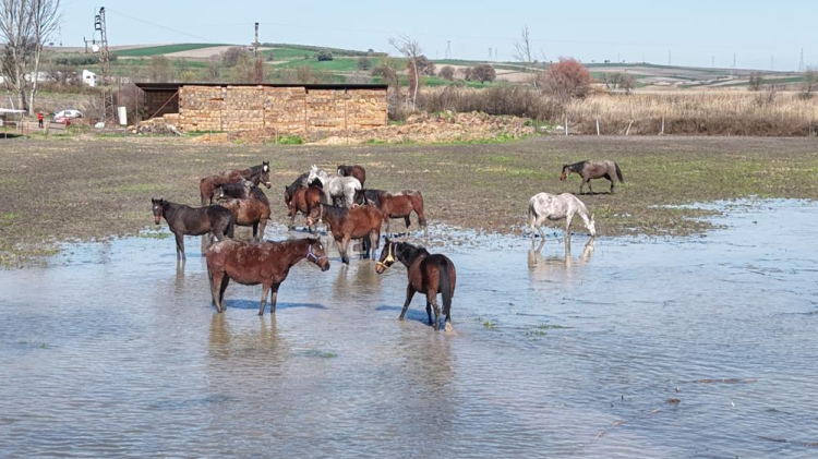Uluabat Gölü, Bursa-İzmir kara yolunun kıyısına kadar gelirken bölgede bulunan milyonluk yarış atlarının bulunduğu tarlalar da su altında kaldı. Arap ve İngiliz yarış atları, su içinde gezinirken drone ile görüntülendi. Milyonluk tayların annesi olan damızlık atların büyük kısmının gebe olması da dikkat çekti.