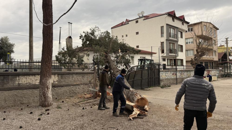 Bursa'nın İznik ilçesi Mustafakemalpaşa Mahallesi'nde etkili olan şiddetli lodos, ilkokul ve ortaokulun ortak kullandığı okul bahçesinde bulunan dev bir çam ağacının devrilmesine neden oldu.