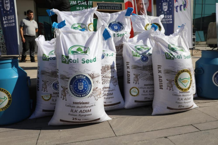 Bursa'da kırsal kalkınmayı güçlendirmek ve üretimi teşvik etmek amacıyla her alanda çiftçiye destek olan Bursa Büyükşehir Belediyesi Yem Bitkileri Yetiştiriciliği Projesi kapsamında 200 üreticiye 5 ton İtalyan çimi dağıttı.