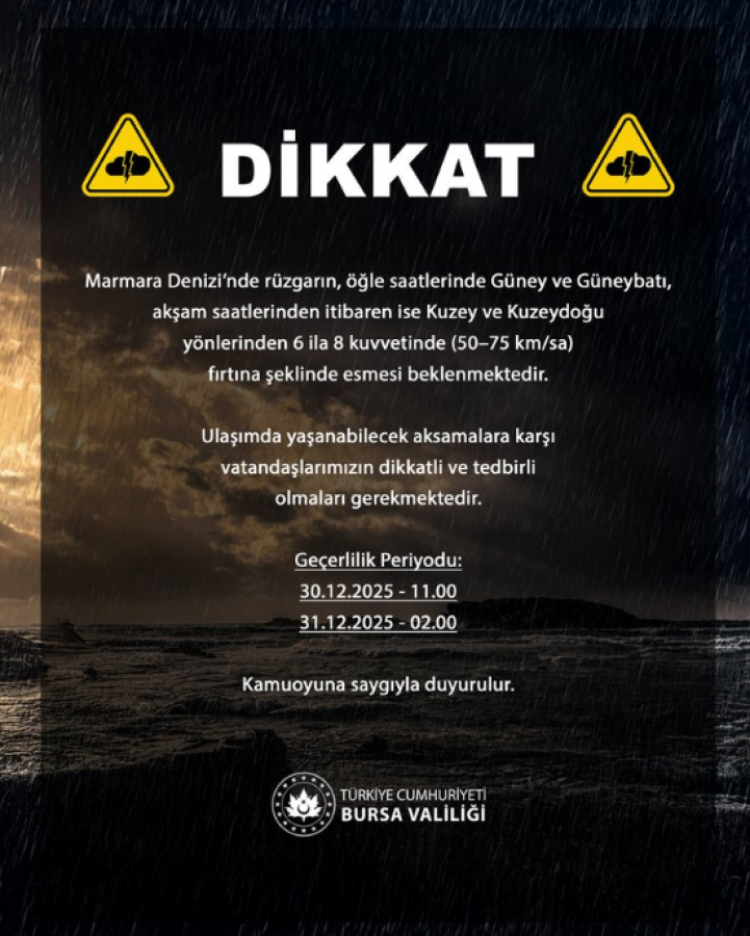 Bursa Valiliği, Marmara Denizi'nde etkili olması beklenen kuvvetli fırtına nedeniyle vatandaşları uyardı.