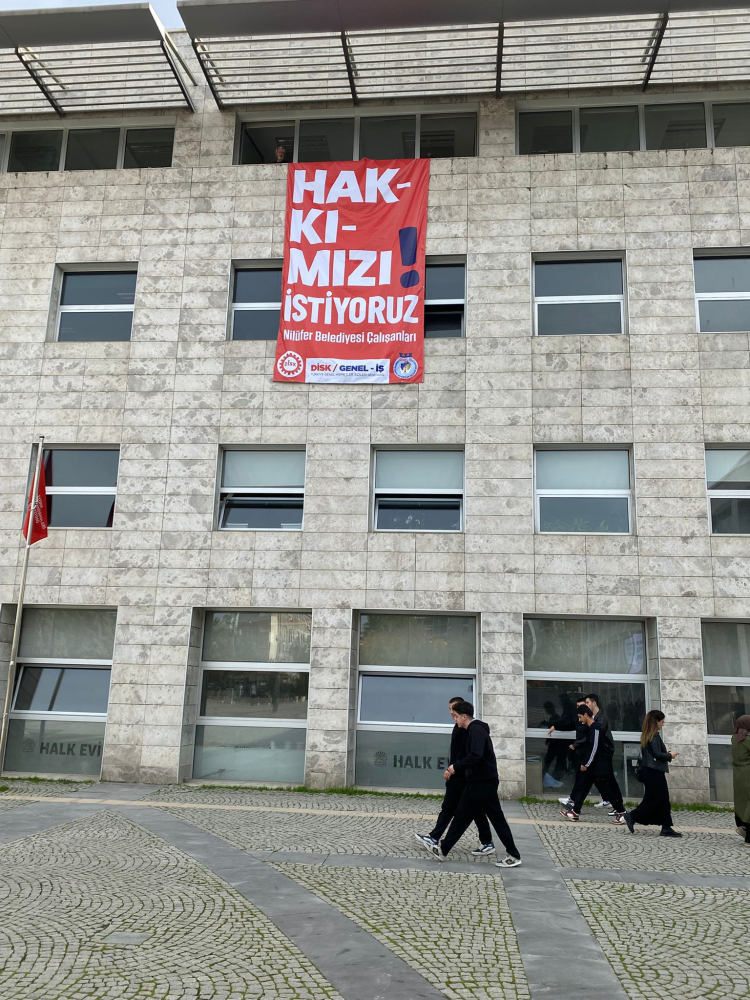 Bursa Nilüfer Belediyesi'nde çalışan Genel-İş üyesi işçiler, 2024 yılında yapılan toplu sözleşmeden doğan fark ücretlerinin yatırılmadığı gerekçesiyle belediye binasına pankart astı. Seslerini belediye yönetimine duyurmak amacıyla 'Nilüfer Belediyesi Halk Evi Hizmet Binasının 3.kat dış cephesine, 'Hakkımızı istiyoruz'' yazılı pankart asan çalışanlar, geçtiğimiz ay kendilerine verilen ödeme yapılacağı yönündeki sözlerin tutulmasını istiyor.