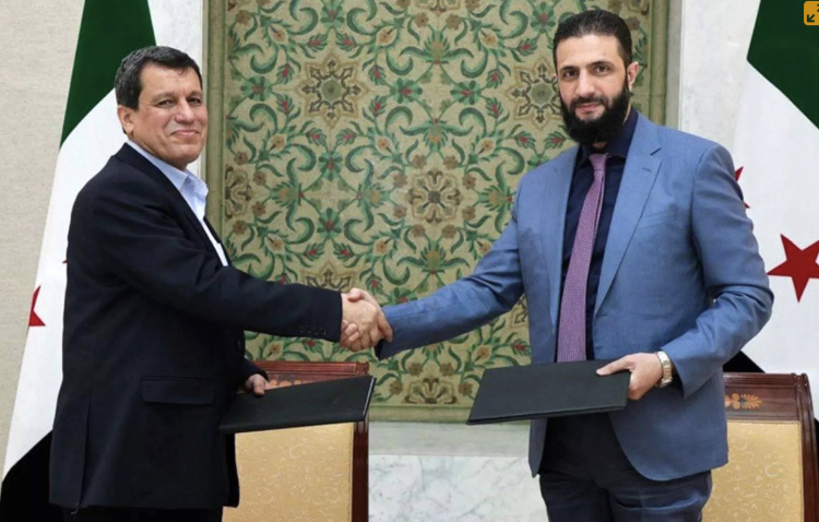 Mazlum Abdi ve Ahmed eş-Şara anlaşma sonrası el sıkışıyor, 10 Mart 2025. (Fotoğraf: SANA)