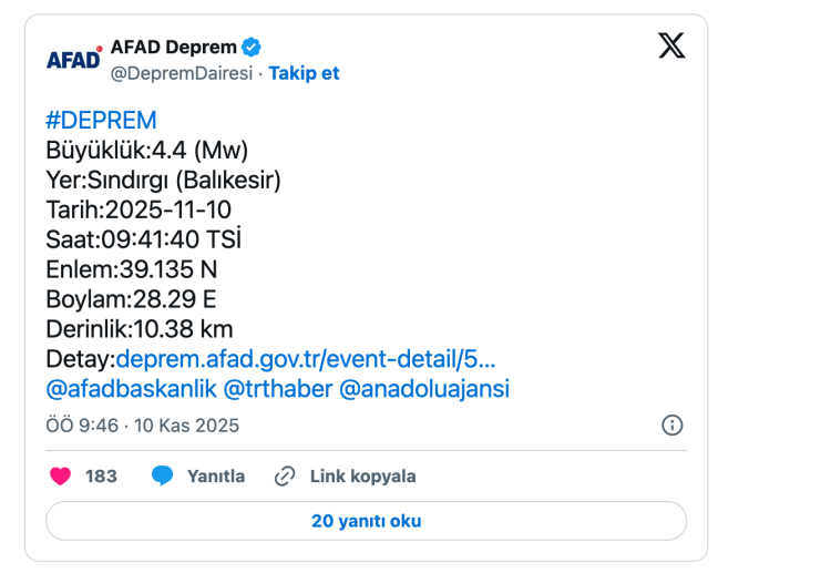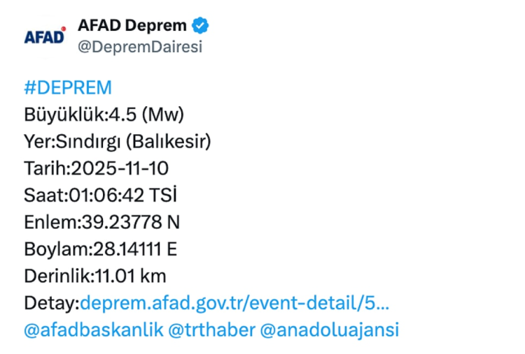 "Balıkesir ilimizin Sındırgı ilçesinde saat 01.06'da meydana gelen 4,5 büyüklüğündeki deprem sonrası an itibarıyla olumsuz bir durum bulunmamaktadır. Saha tarama çalışmaları devam etmektedir. Etkilenen vatandaşlarımıza geçmiş olsun dileklerimizi sunarız."