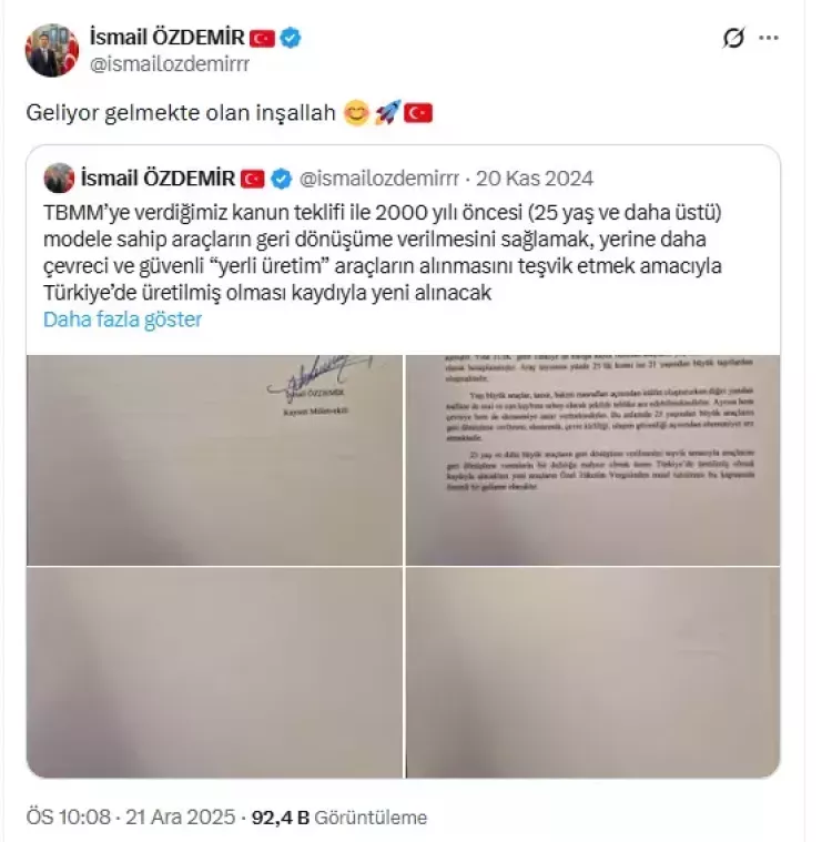 MHP Kayseri Milletvekili İsmail Özdemir, sosyal medya hesabından yaptığı paylaşımda daha önce TBMM’ye sundukları hurda teşviki dilekçesini hatırlatarak, "Geliyor gelmekte olan inşallah" ifadelerini kullandı.
