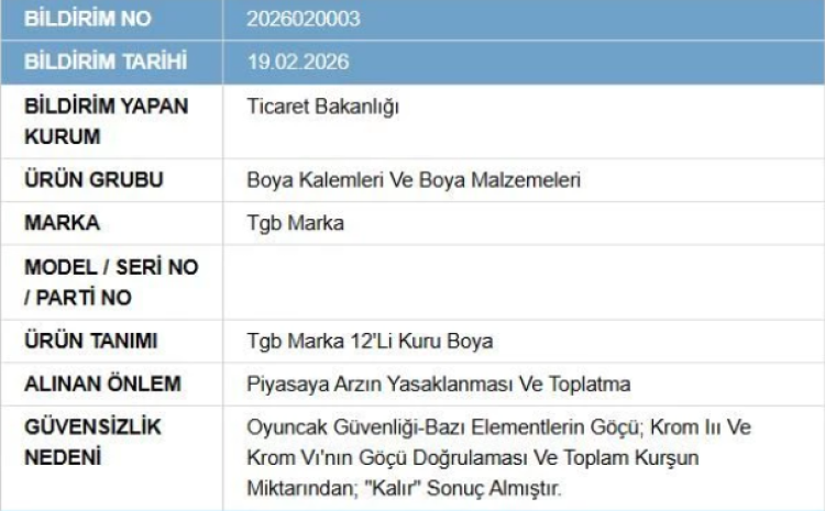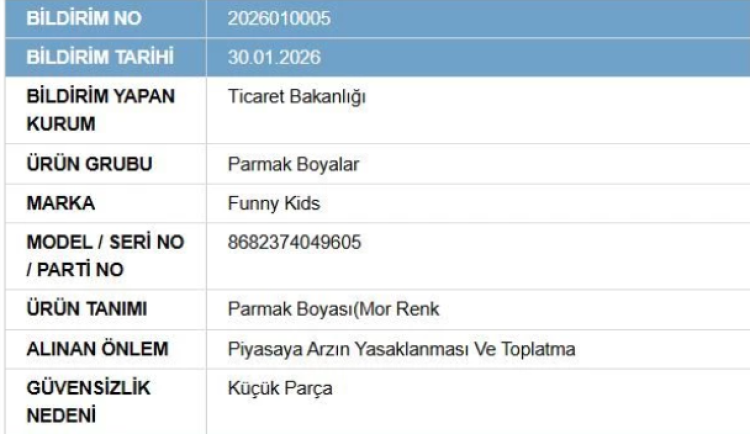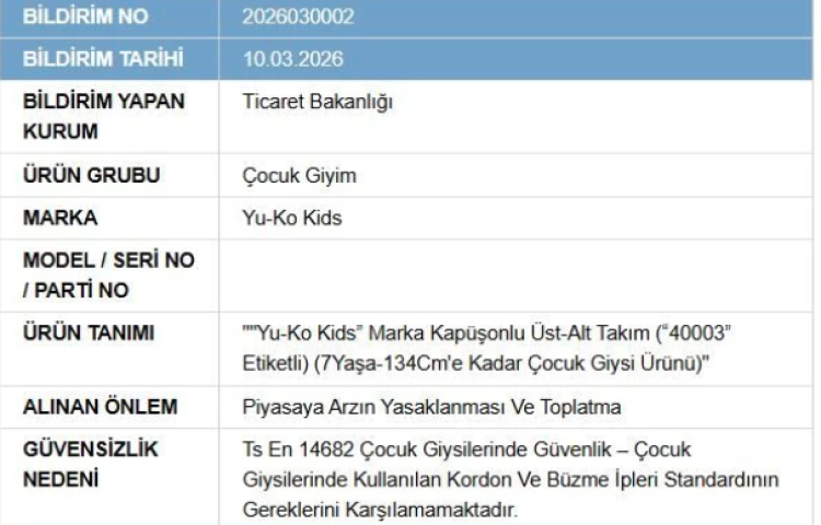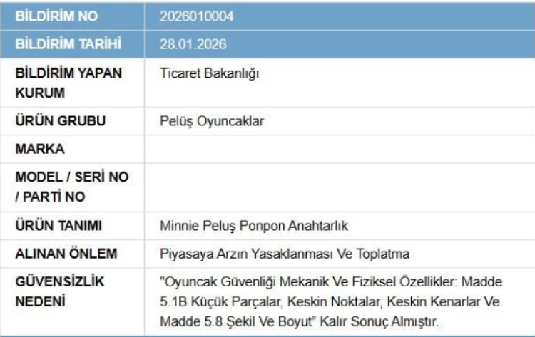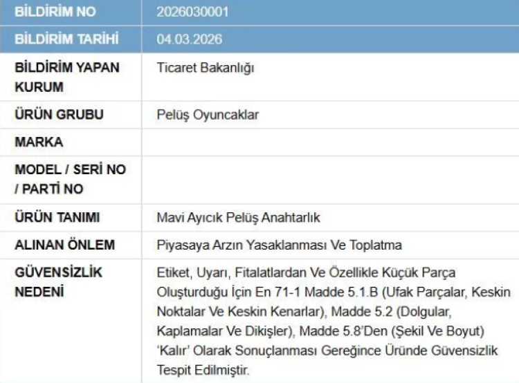 Ticaret Bakanlığı tarafından yürütülen denetimler kapsamında, güvensiz olduğu tespit edilen ürünlere yönelik yeni bir karar alındı. Bakanlık, 8 ürünün daha piyasadan toplatılmasına hükmedildiğini açıkladı. Bakanlık tarafından ifşa edilen ürünlerin bu kez çocuk markaları olması dikkat çekti.