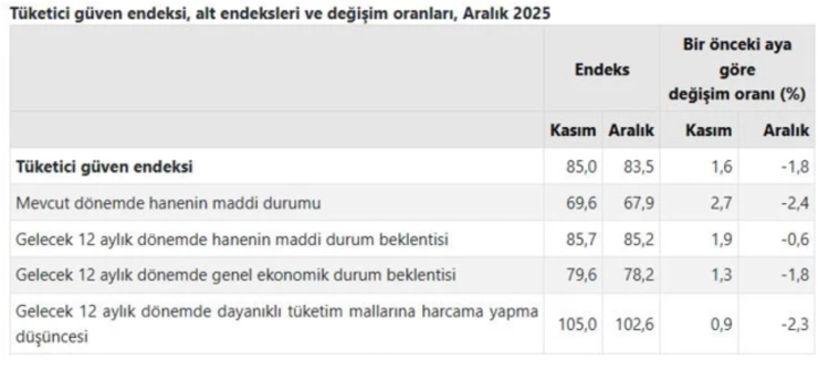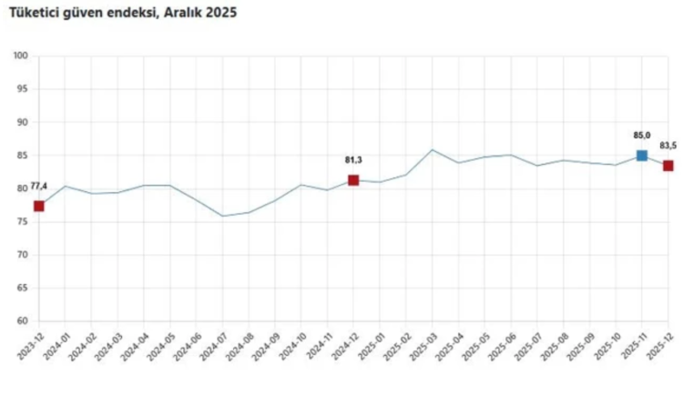 Tüketici güven endeksi, aralık ayında yüzde 1,8 oranında azalarak 83,5 seviyesinde gerçekleşti.