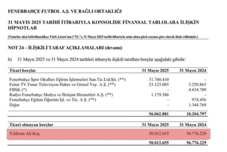 Habertürk’ün aktardığına göre, Koç’un başkanlık süresi boyunca Fenerbahçe’nin finansal borcu azaldı, kulübün varlıkları ise 12,5 milyar liraya yükseldi. Kulübün 29 Şubat 2025 tarihli 9 aylık bilançosunda, Ali Koç’un sarı-lacivertlilere 413 milyon TL borç verdiği görülüyordu. Ancak 31 Mayıs 2025 bilançosunda bu rakamın 50 milyon 12 bin TL’ye düştüğü kayıtlara geçti. Böylece, iki bilanço dönemi arasında Koç’un yaklaşık 360 milyon TL’sini tahsil ettiği belirlendi.