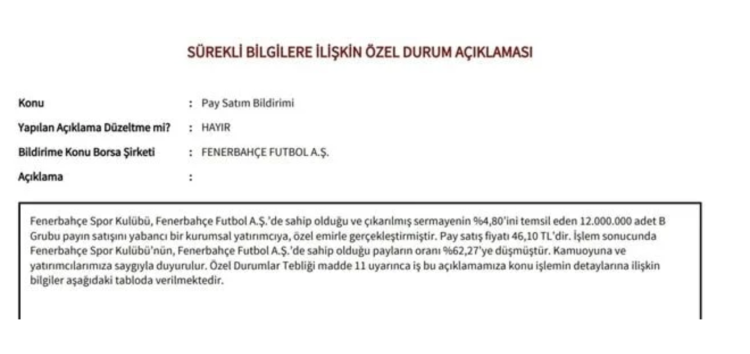 Aynı dönemde Fenerbahçe’nin yaptığı hisse satışı da dikkat çekti. Kulüp, nisan ayında şirket sermayesinin yüzde 4,8’ine denk gelen 12 milyon B grubu hisseyi 46,10 lira fiyattan yabancı bir kurumsal yatırımcıya satmıştı. Bu işlemden kulübün kasasına yaklaşık 553 milyon TL girdiği açıklanmıştı. Bu rakamın, Ali Koç’un geri aldığı miktara yakın olması, dikkat çeken bir diğer gelişme oldu.
