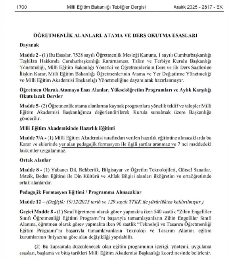 Artık öğretmen adayları pedagojik formasyon yerine, yalnızca Milli Eğitim Akademisi’nde verilecek hazırlık eğitimini tamamlamakla yükümlü olacak. Aralık 2025 tarihli ve 2817 sayılı Tebliğler Dergisi’nde yayımlanan karara göre, öğretmenlik alanları, atama ve ders okutma esaslarında değişikliğe gidildi. Yeni sistemle birlikte pedagojik formasyon, öğretmenlik için zorunlu bir ön koşul olmaktan kaldırıldı.