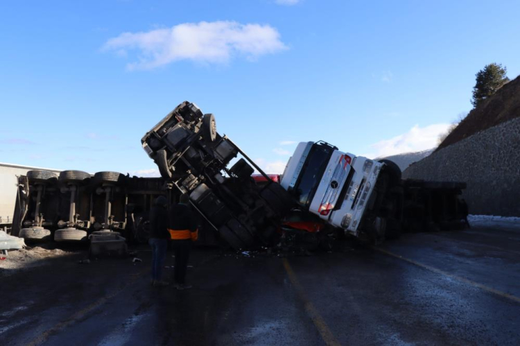 Ardahan'ın Posof ilçesi Ilgar Dağı'nda, buzda kayan 2 tır, otomobilin üzerine devrildi, kazada 1 kişi yaralandı.