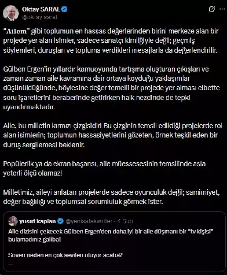 Cumhurbaşkanı Başdanışmanı Oktay Saral, sosyal medya hesabı üzerinden yaptığı paylaşımla Milli Eğitim Bakanlığı tarafından hazırlanan ve okul-aile iş birliğini geliştirmeyi amaçlayan “Ailem” dizisine yönelik eleştirilerini dile getirdi. Sanatçı Gülben Ergen’in projede yer almasına karşı çıkan Saral, geçmiş söylem ve tutumların dikkate alınması gerektiğini belirtti.