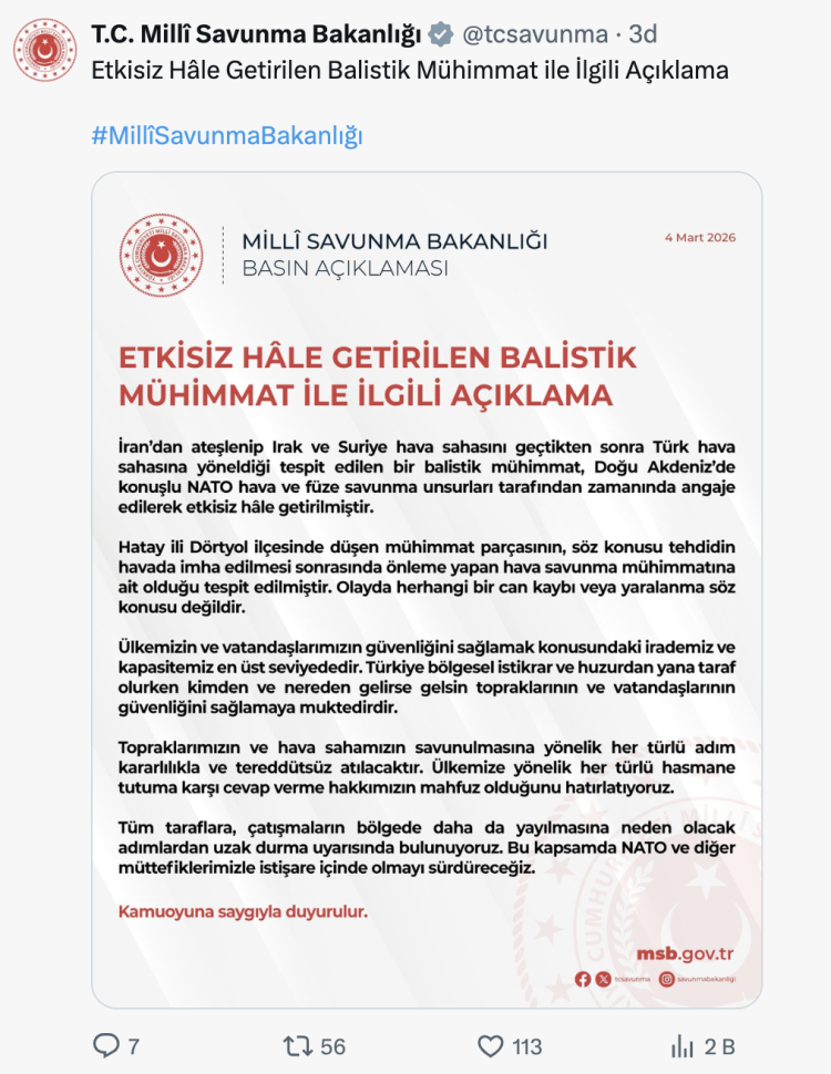 ''İran'dan ateşlenip Irak ve Suriye hava sahasını geçtikten sonra Türk hava sahasına yöneldiği tespit edilen bir balistik mühimmat, Doğu Akdeniz'de konuşlu NATO hava ve füze savunma unsurları tarafından zamanında angaje edilerek etkisiz hale getirilmiştir.