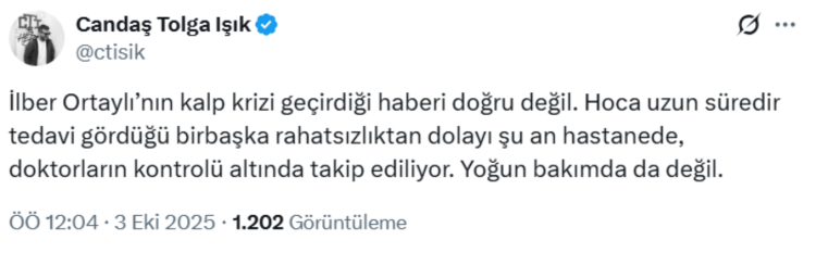 Ancak iddiaların ardından Ortaylı ile birlikte programlar yapan gazeteci Candaş Tolga Işık, sosyal medya hesabı üzerinden açıklama yaptı. Işık, “İlber Ortaylı’nın kalp krizi geçirdiği haberi doğru değil. Hoca uzun süredir tedavi gördüğü bir başka rahatsızlıktan dolayı şu an hastanede, doktorların kontrolü altında takip ediliyor. Yoğun bakımda da değil,” ifadelerini kullandı.