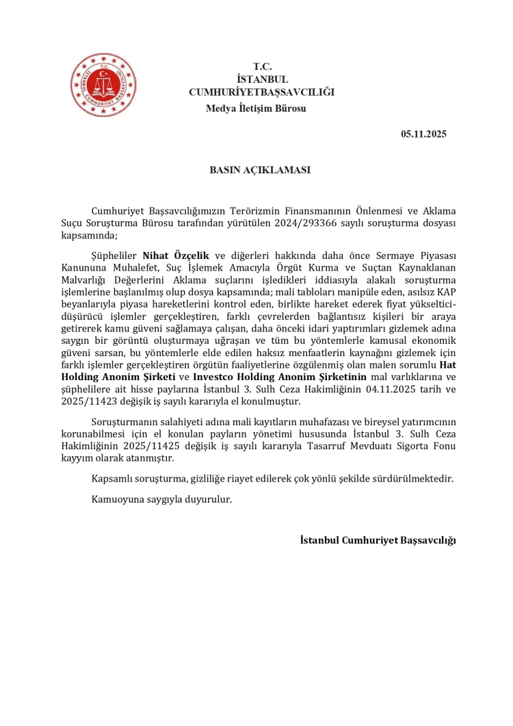 İstanbul Cumhuriyet Başsavcılığı Terörizmin Finansmanının Önlenmesi ve Aklama Suçları Soruşturma Bürosu tarafından yürütülen soruşturma kapsamında Hat Holding A.Ş. ve Investco Holding A.Ş. hakkında önemli bir gelişme yaşandı. Şirketlerin mal varlıklarına ve şüphelilere ait hisse paylarına el konulurken, bu varlıkların yönetimi için Tasarruf Mevduatı Sigorta Fonu (TMSF) kayyum olarak atandı.
