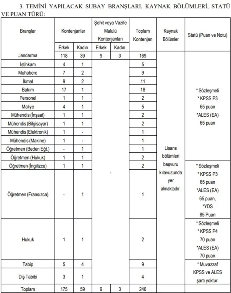 Toplamda 246 subay temin edilecek; bunlardan 13’ü muvazzaf, 233’ü sözleşmeli olacak.